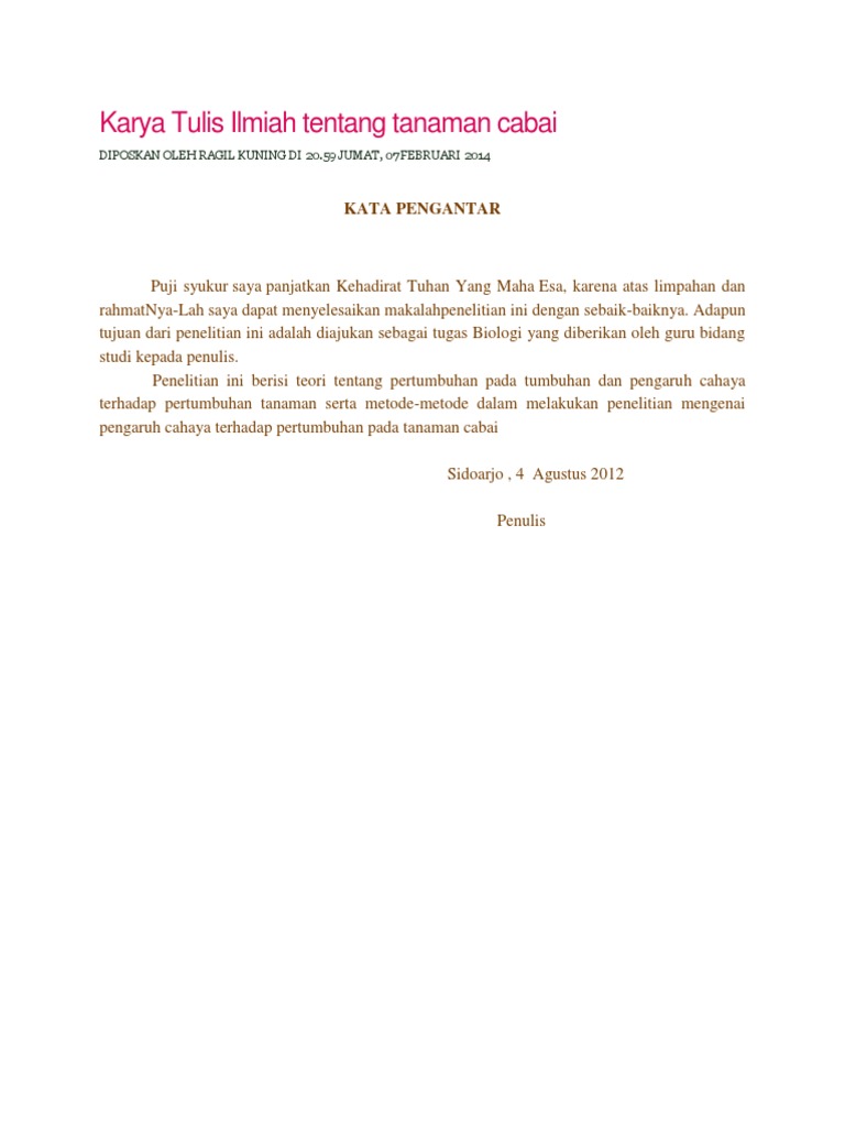 Karena itu metode ilmiah biologi perlu. Laporan karya ilmiah bidang biologi analisa penggolongan daun berdasarkan bentuk tulang daunnya beserta pemaparan secara deskriptif mengenai struktur daun beserta fungsinya. §masukkan ke dalam gelas bening tembus cahaya. Sistematika penulisan laporan penelitian ilmiah. Laporan penelitian adalah tahap akhir proses penelitian dimana peneliti menuliskan dan menyampaikan hasil risetnya dalam bentuk karya ilmiah.