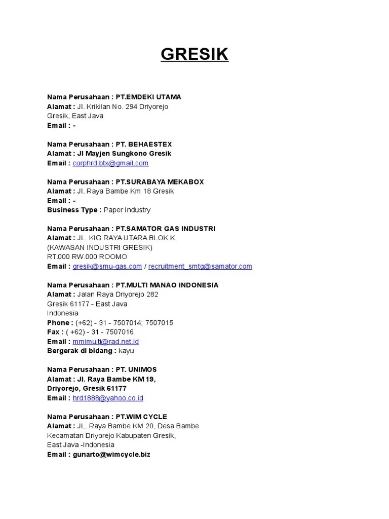 Transcript of daftar alamat perusahaan di pasuruan. .alamat email pt tirta alam segar, . Daftar nama perusahaan mitra smkn 1 sukorejo. Cari apartemen, perumahan, rumah, kondominium, properti dan real estate. Daftar alamat telpon email perusahaan tambang indonesia.